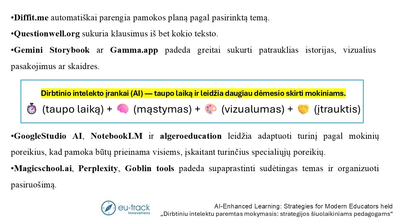 Pristatymo metu mokytojai buvo pakviesti į spalio mėnesį vyksiančius praktinius mokymus, kuriuose bus galima detaliau susipažinti su šiais įrankiais ir jų pritaikymu kasdienėje mokytojų veikloje.