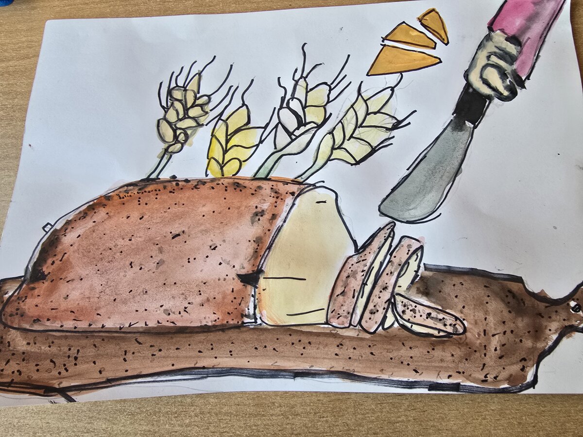 Vėliau pakartojome duonos kelią, prisiminėme jos rūšis, piešiniuose stengėmės išgauti duonelės formą ir spalviškumą, vykdėme apklausą apie mėgstamiausią valgyti duoną, pildėme duomenų dažnių lentelę bei braižėme stulpelines diagramas.
