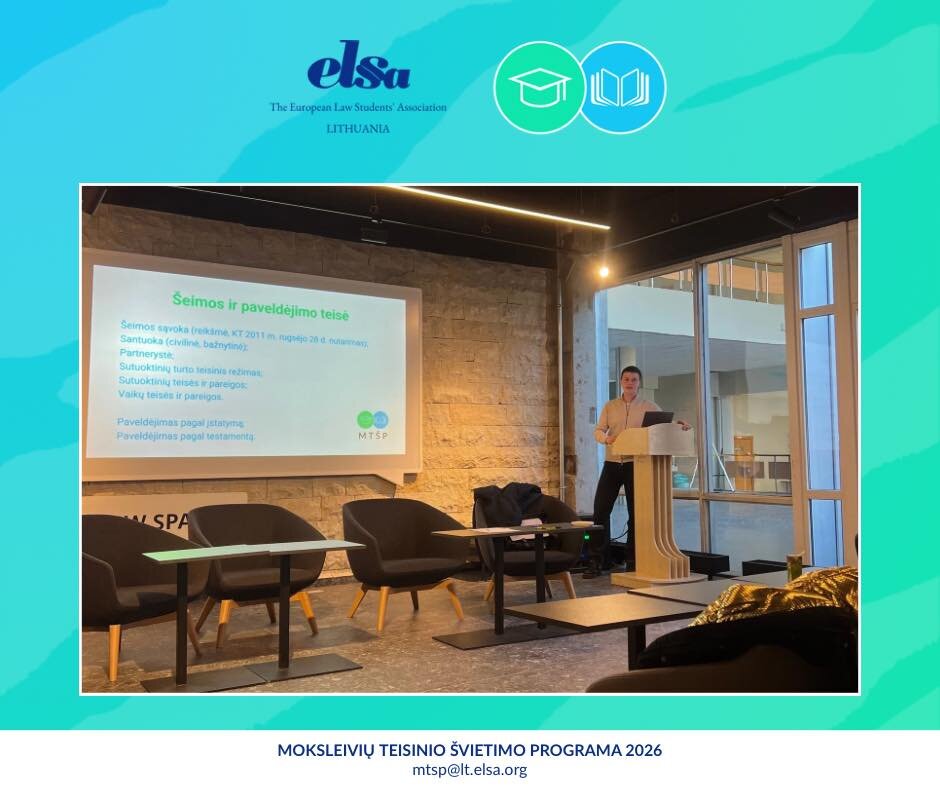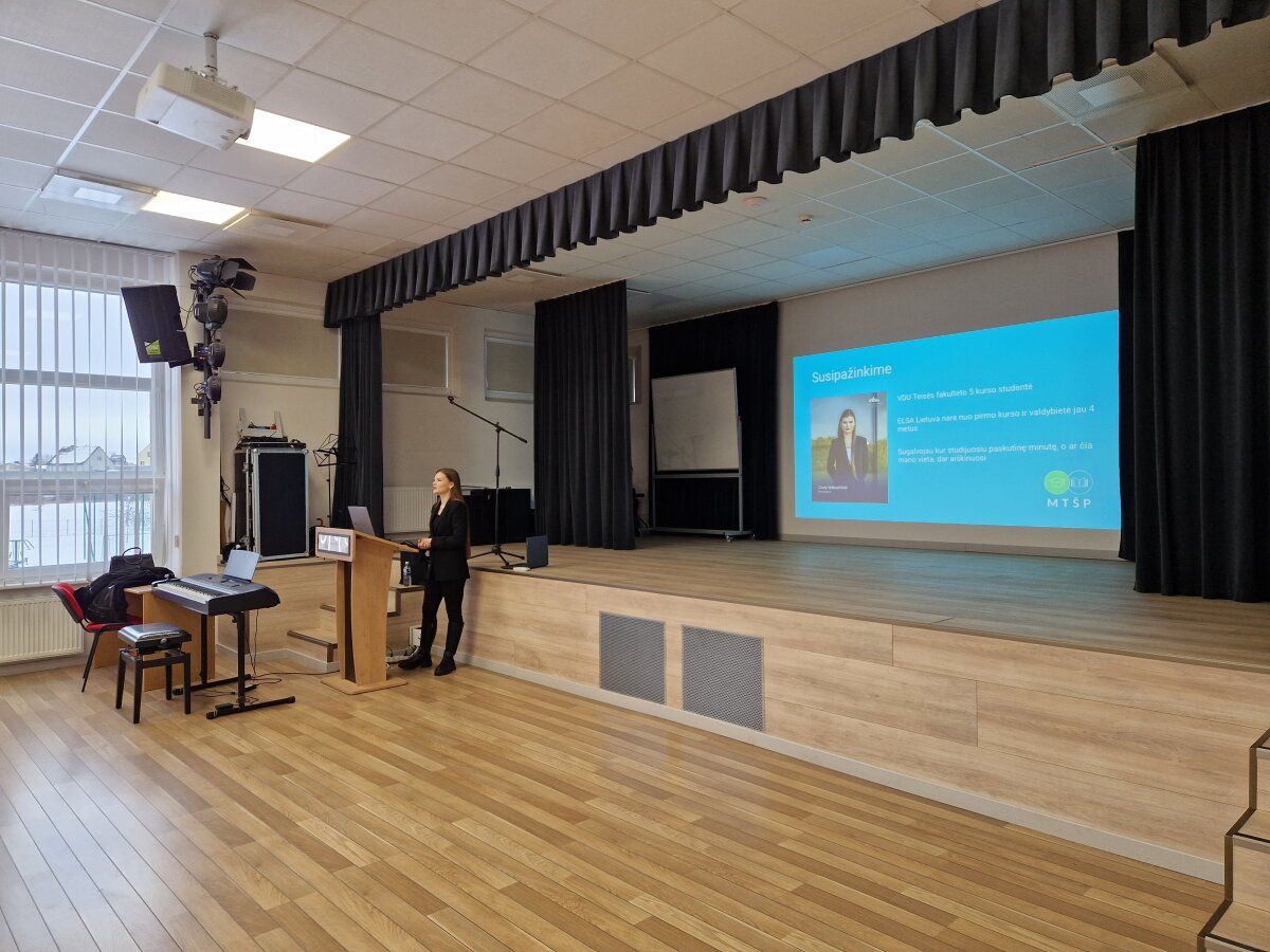 Vizito metu ELSA Lietuva prezidentė supažindino mokinius su asociacijos veikla, papasakojo apie teisės studijas, pristatė MTŠP projektą bei pakvietė mokinius išbandyti savo teisines žinias interaktyvioje viktorinoje.